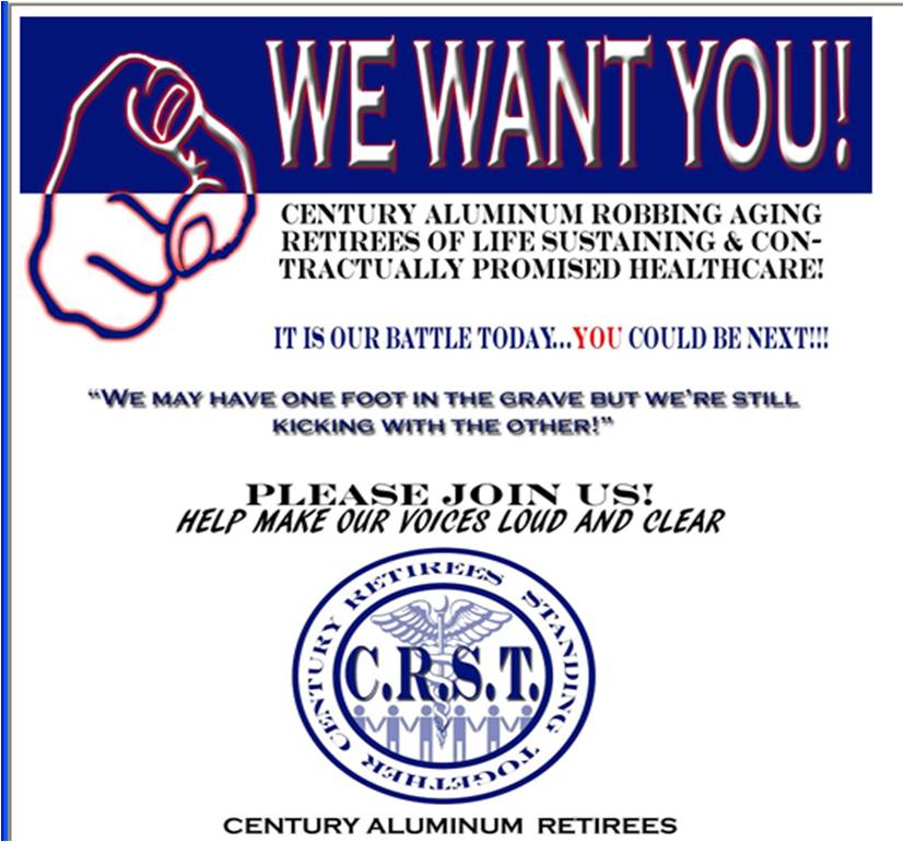 We are the approximately 500 families, who after working for many years at the Ravenswood Works under various aluminum company names, who met the contractual requirements to retire with lifetime Insurance and Prescription benefits, each based on the contract benefits that were in effect at the time of retirement. The executives at Century Aluminum Company unilaterally made the decision to modify these contractual obligation by terminating these benefits to increase their profit margins and apparently to reward themselves with larger bonuses. This resulted in not only wiping out of Insurance and Prescription benefits but also a large portion, if not all, of the retiree pensions due to having to spend their pension money on insurance or try to survive without coverage.